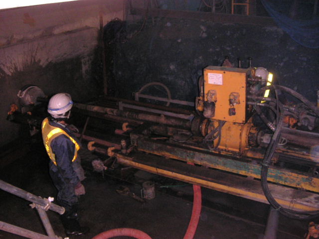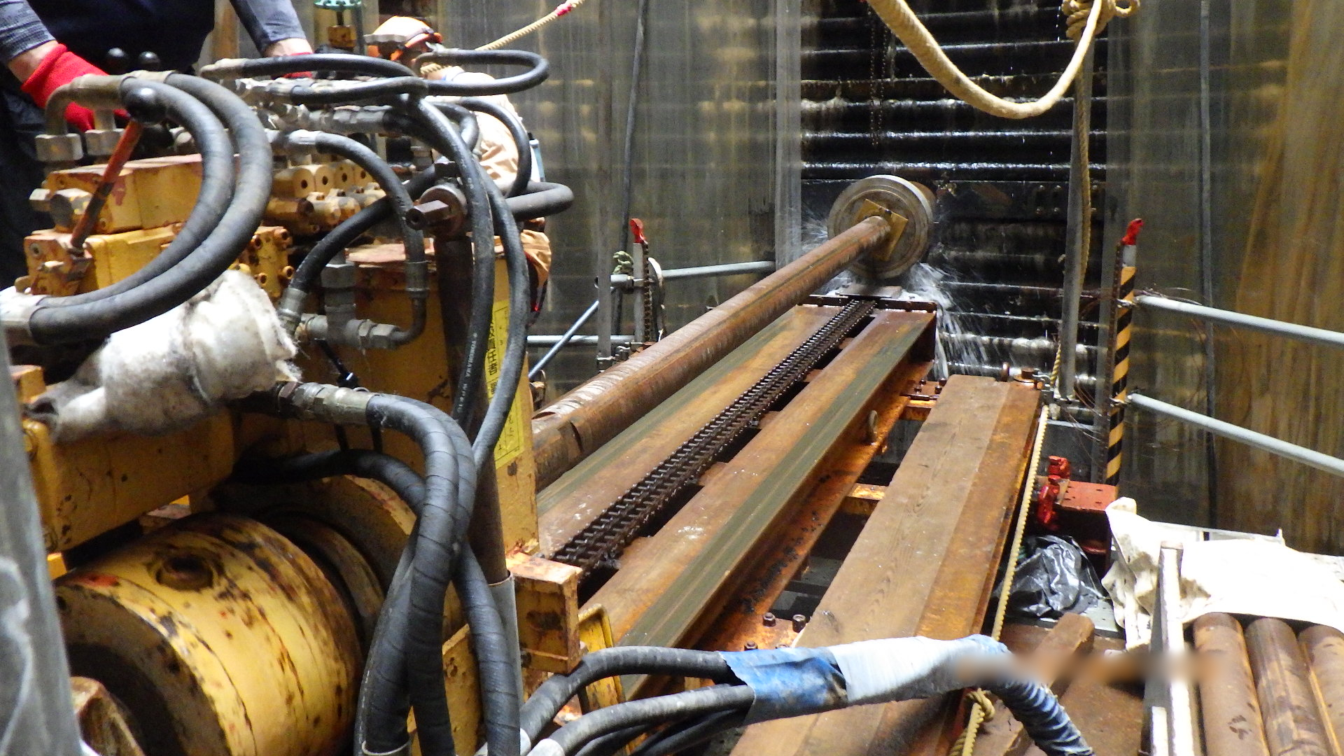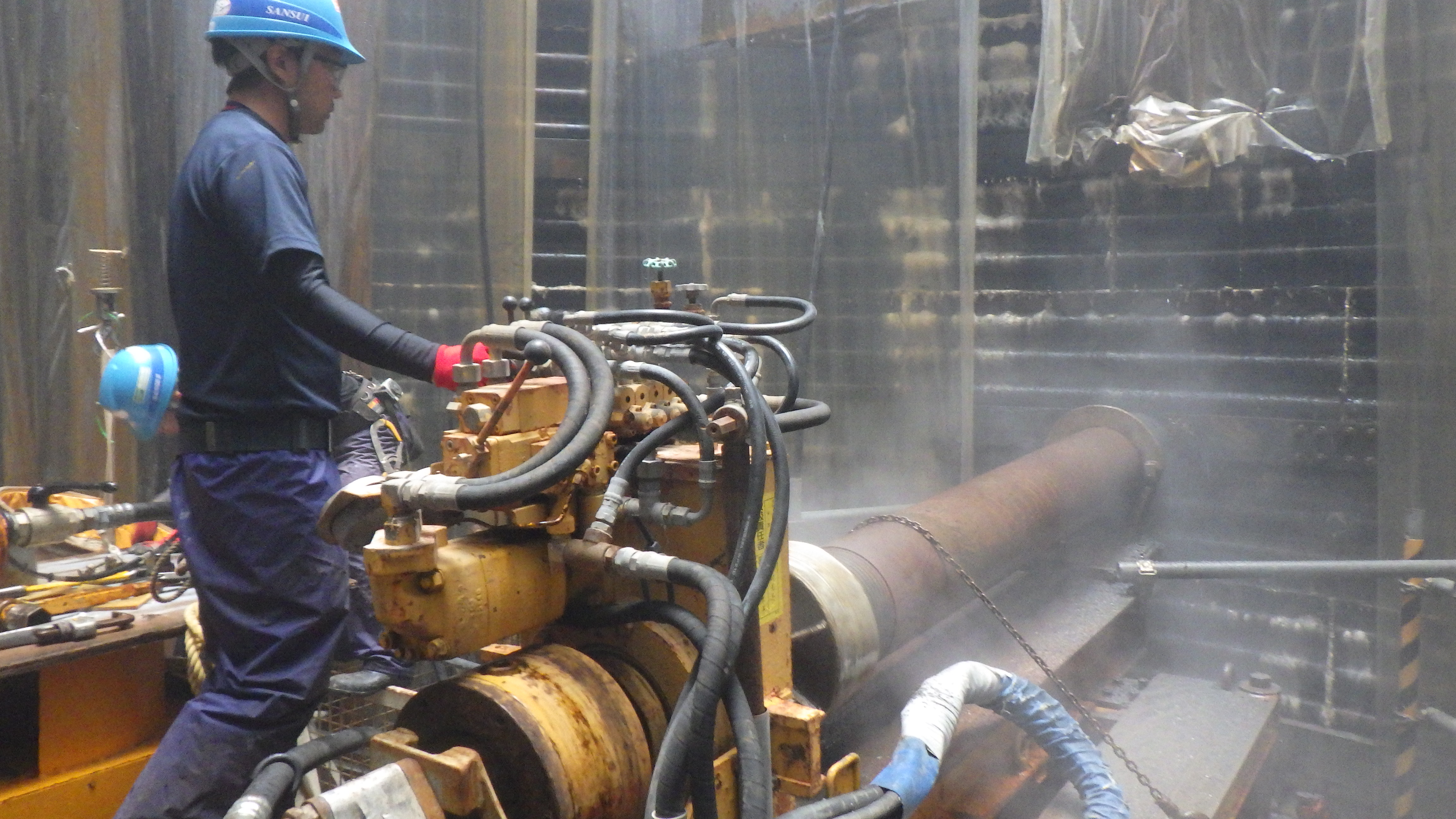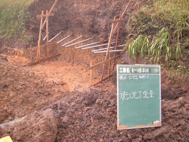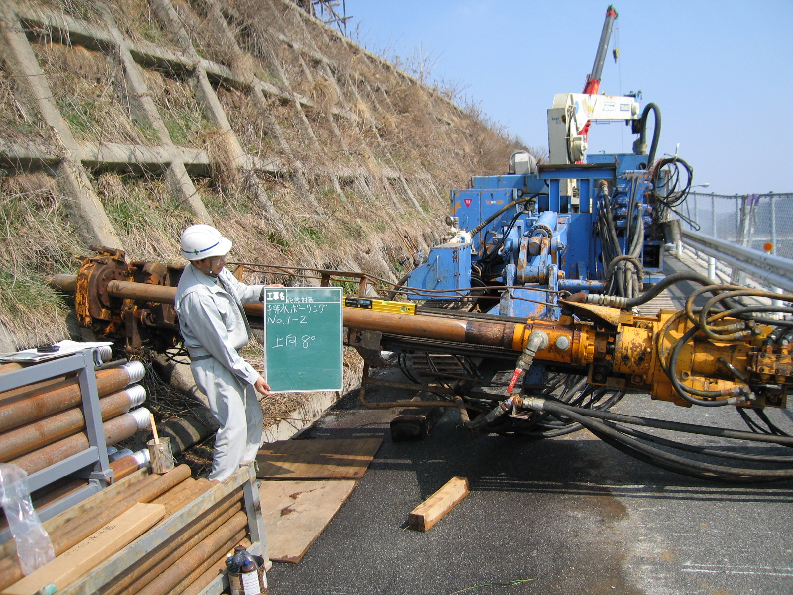 地下水を設置した排水管により排除することで地すべりを防ぐための、横向きのボーリング工です。